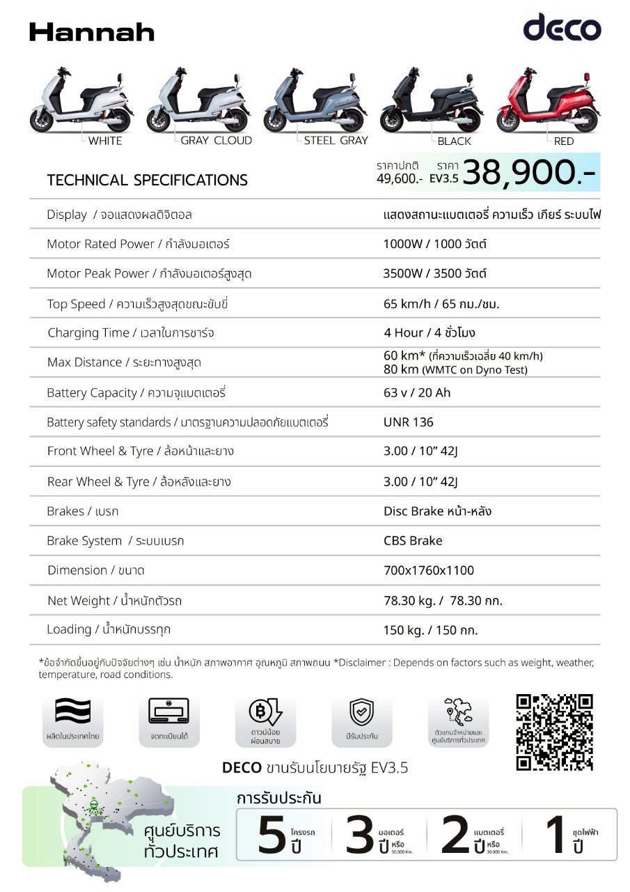 | ชื่อสินค้า - DECO HANNAH รถมอไซต์ไฟฟ้า รุ่น standard แบตเตอรี่ 1 ลูก กำลังมอเตอร์ 1,000W ความเร็ว 65 km/h |
