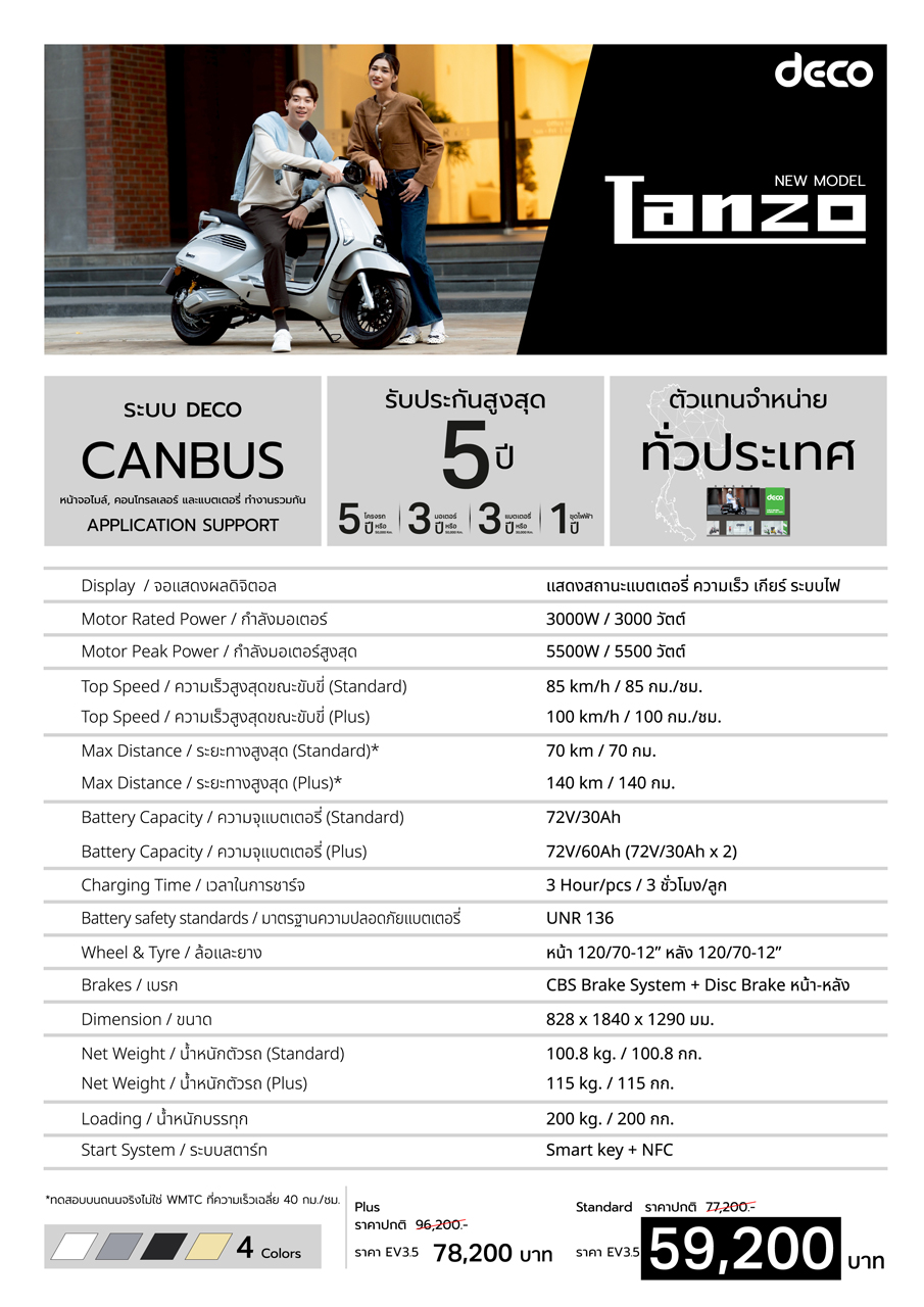 | ชื่อสินค้า - DECO LANZO รถมอไซต์ไฟฟ้า รุ่น standard แบตเตอรี่ 1 ลูก กำลังมอเตอร์ 3000W ความเร็ว 85 km/h |
